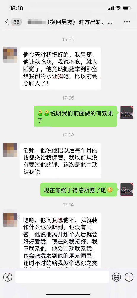 于是我们导师告诉张小姐要理智地分析对方的心境和态度,慢慢地进行互动,每一条短信和电话都经过精心的编辑,让前男友毫无芥蒂地与她进行交流,进一步完成二次吸引。